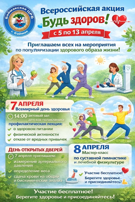 Всероссийская акция «Будь здоров!» в Баймакской ЦРБС 5 по 13 апреля в Баймакской центральной районной больнице проходит Всероссийская акция «Будь здоров!», направленная на популяризацию физической активности и здорового образа жизни.