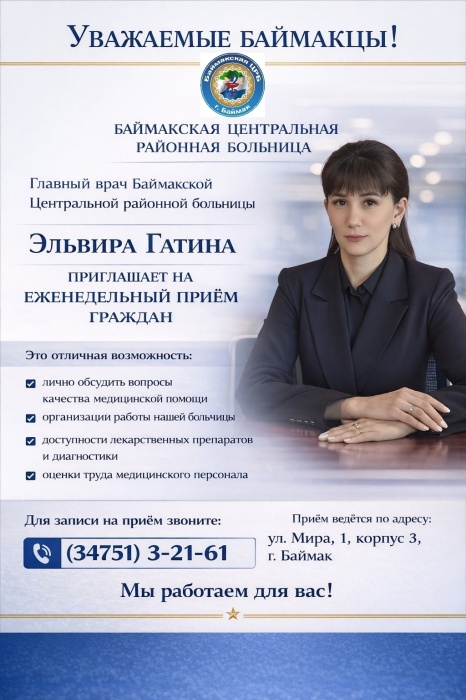 Главный врач Баймакской центральной районной больницы Эльвира Гатина, приглашает вас на личный прием граждан, который пройдет: